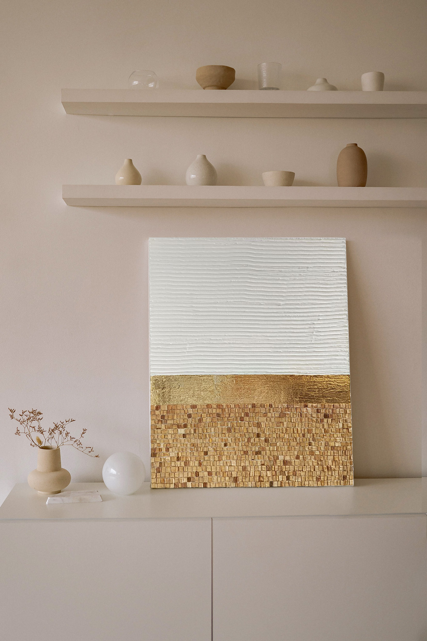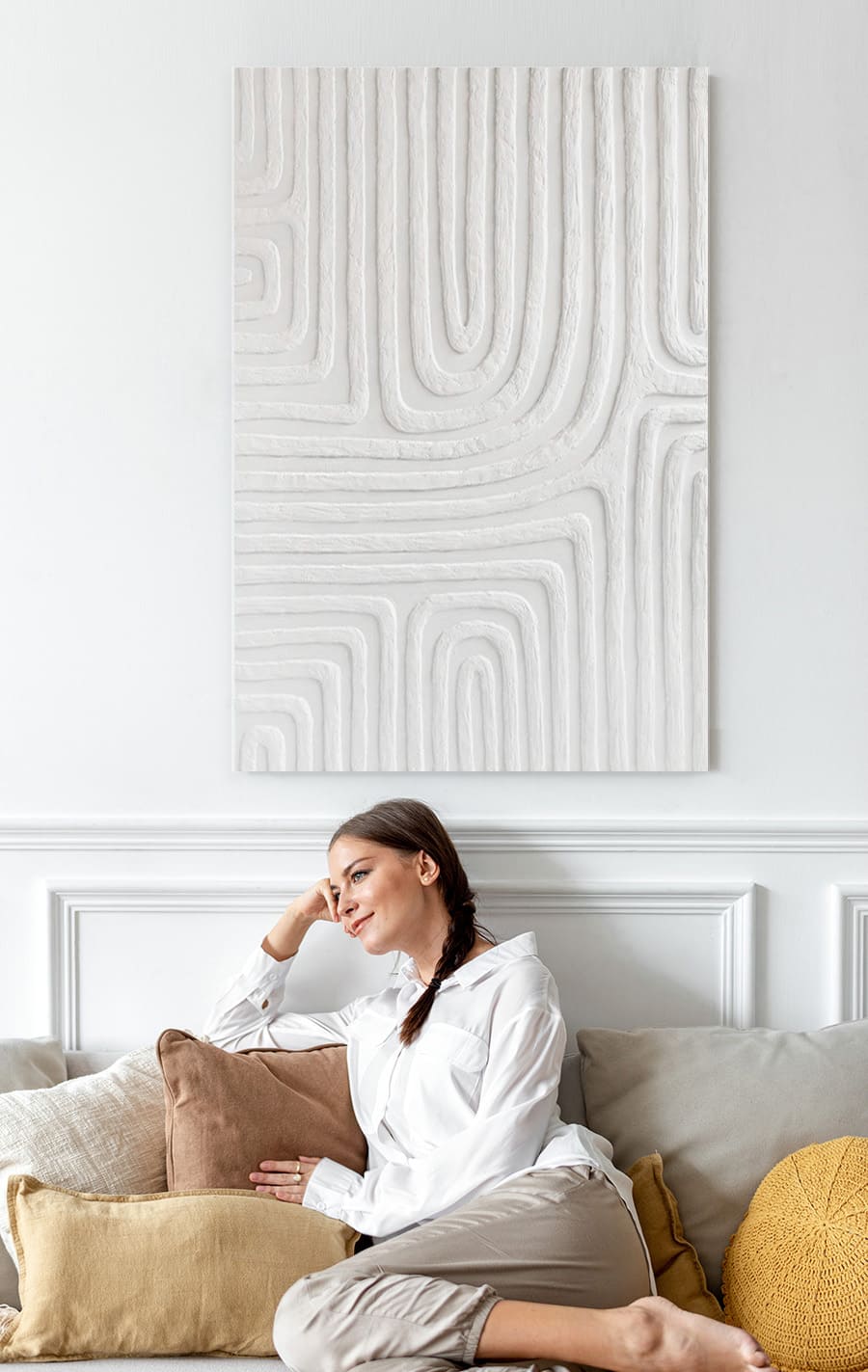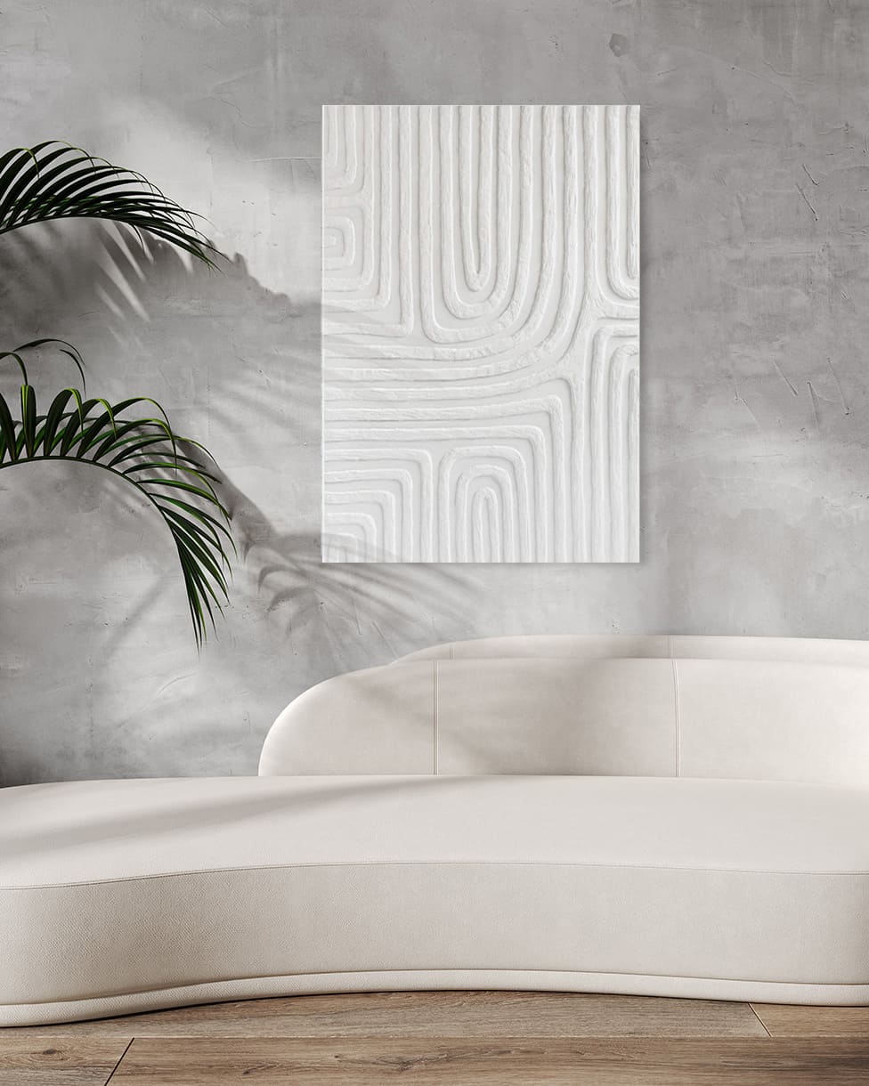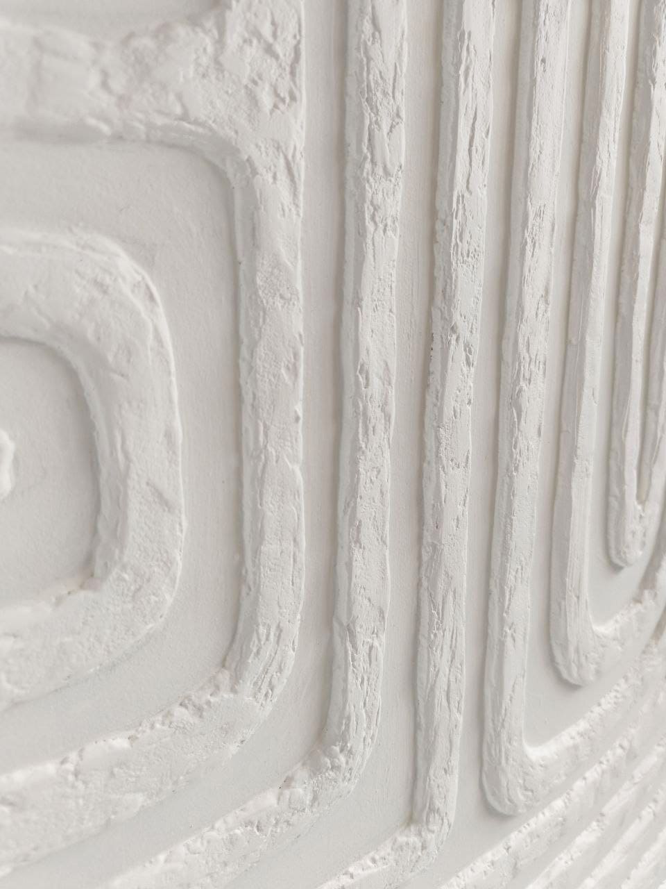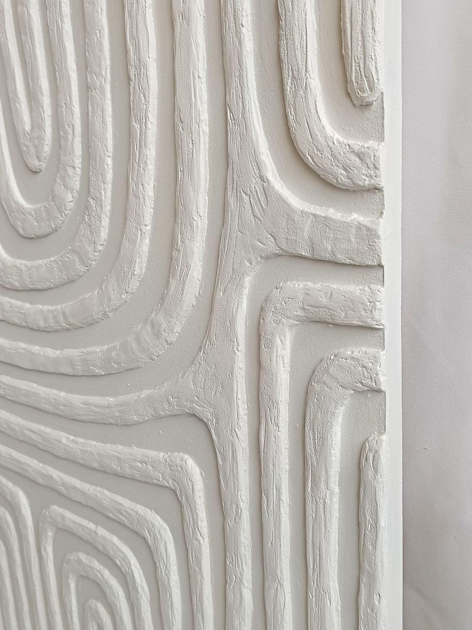 Представьте в своём интерьере белое минималистичное панно — воплощение современного стиля и элегантности. Созданное из текстурной пасты, оно очаровывает уникальным шармом ручной работы, проявляющимся в деликатных шероховатостях. Динамичная композиция напоминает сложный узор, будто хранящий в себе зашифрованный код к дзену и глубокому вдохновению.