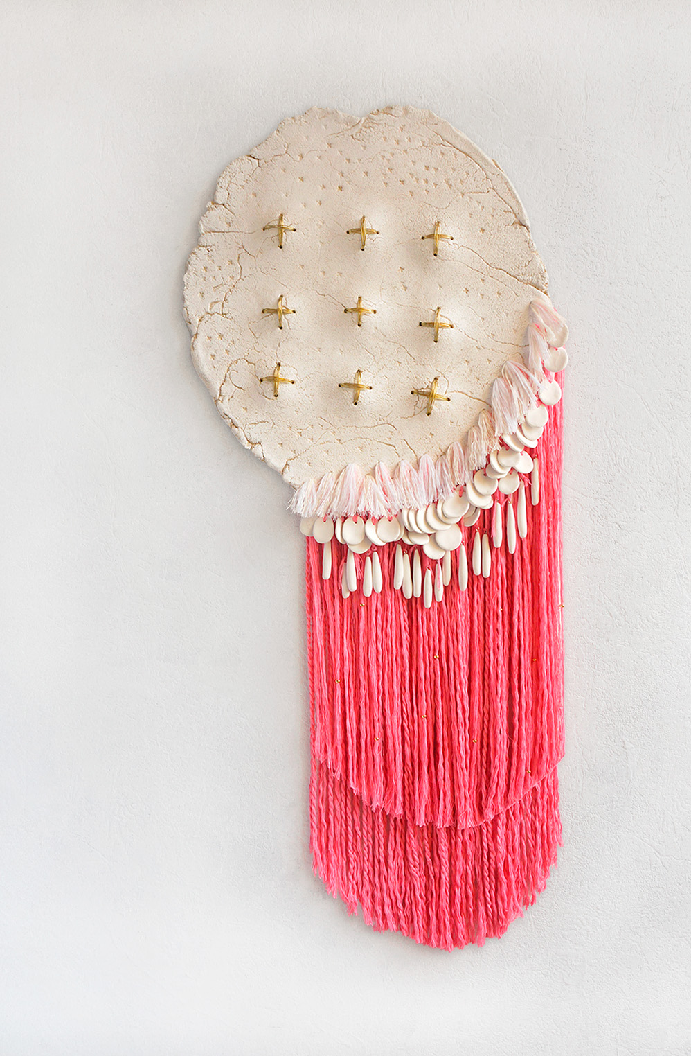 Наше концептуальное панно «Женский круг» из светлой шамотной глины с алыми нитями и золотыми крестиками — современная уникальная авторская работа