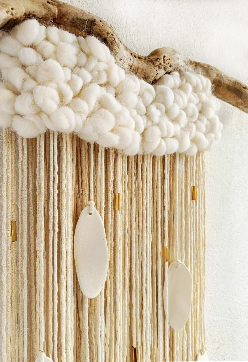 Панно «Барашек» — поэтичное воплощение степных просторов. Каскад светлых веревочек напоминает извилистые тропинки, уходящие за горизонт. Белые фарфоровые перышки и теплые золотистые бусины добавляют композиции приятное очарование. Элегантные линии дрифтвуда, словно отпечатки времени, привносят ощущение вечности и естественной красоты. В центре, словно пушистое облачко, уютно расположился барашек из белой пряжи — символ безмятежности и покоя