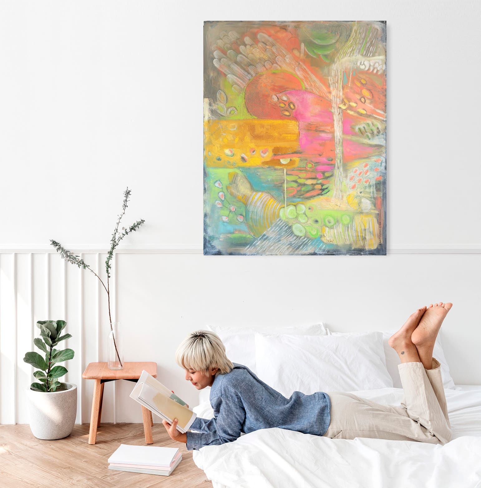 Яркая, экспрессивная, мощная по энергетике картина. Такой цветовой акцент может стать изюминкой в интерьере кабинета психолога и даже в офисе, делая строгое пространство более подвижным и теплым.