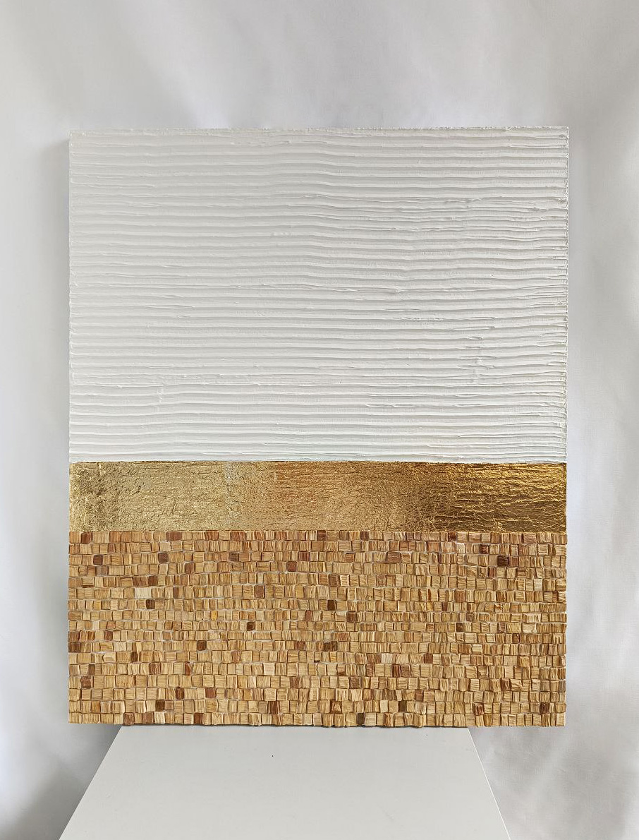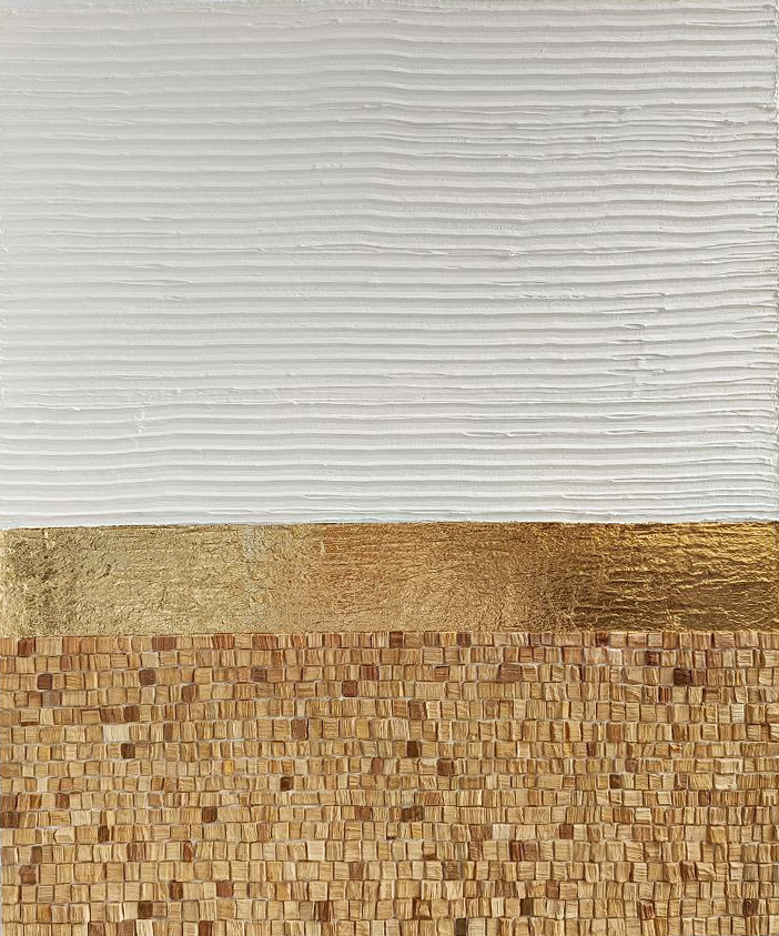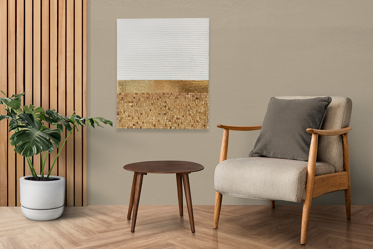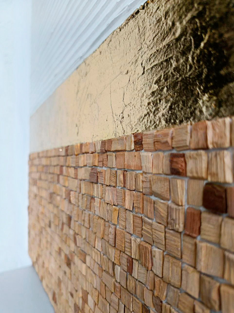 Декоративное панно, выполненное в технике мозаики из яблоневой щепы, дополненной элементами золотой потали и декоративной штукатурки. Этот универсальный элемент декора прекрасно подходит как для деловых пространств, так и для современного домашнего интерьера, добавляя изысканность и стиль в любое окружение